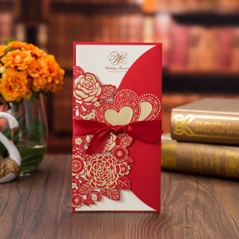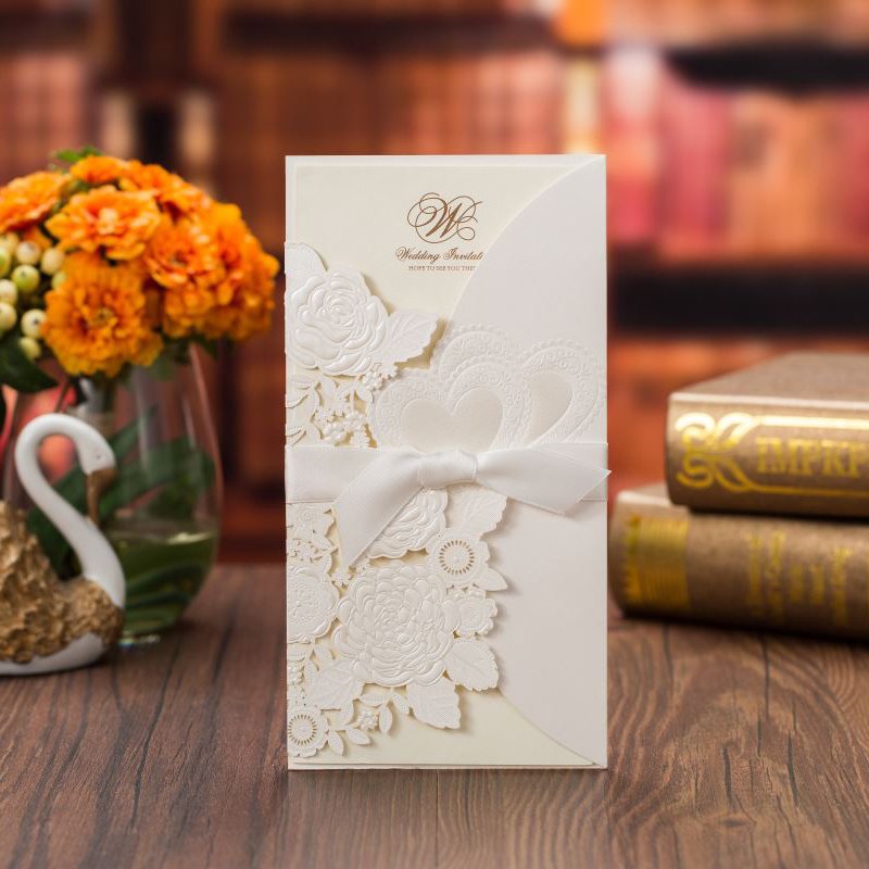 1pcs Love Heart Laser Cut Wedding Invitation Card Rose Flower Greeting Card Customize With Ribbon Party Favor Wedding Decoration