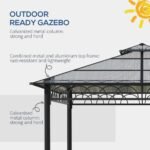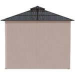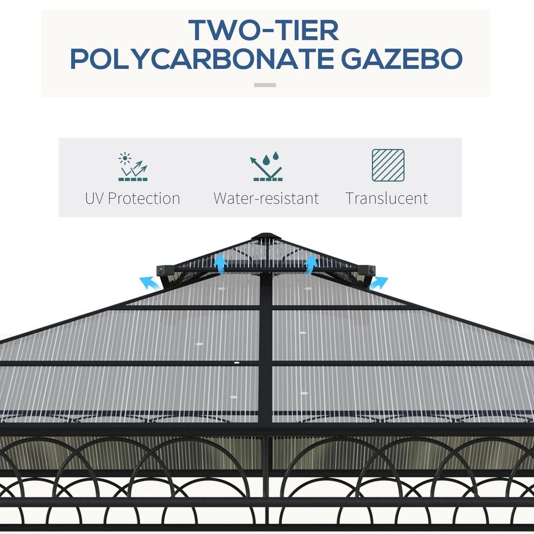 300 x 300cm size: A garden gazebo which is large and spacious, giving you plenty of sheltered room for your outdoor events – parties and gatherings, BBQs, or simply your own private place.Two-tier hardtop roof: Polycarbonate gazebo has a strong and protective top, keeping you protected from weather inside this hard roof gazebo.Curtains and netting: An easy way to create a private atmosphere when fully down. Gazebo with netting protects.Accessories included: Eight ground stakes to pin metal gazebo to the ground and eight expansion screws.Dimensions: 278H x 300L x 300Wcm. Eave: 206Hcm. Do not leave standing up in heavy weather, such as rain, wind and snow. Assembly required.