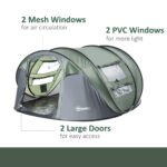 FOUR/FIVE MAN: Large and spacious, the tents for camping are suitable for family and friends camping out together. Brings everyone together for fun memories day and night.POP-UP DESIGN: Instant design – simply take out the bag, set up and it’s yours to use. Hassle-free setting up and packing away, no stress. Water-resistant polyester shell to keep you lightly protected.TWO WINDOWS AND DOORS: Allows fresh air inside of the dome tents to keep you cool. Buckle fastening on both to roll up and keep in place. Easy to enter and leave.LAMP HOOK: Light up at night. DIMENSIONS: 123H x 263.5L x 220cm. Inner: 117H x 259L x 213Wcm. Folded: 3H x ��100cm.INFORMATION: Including 1 Carry Bag, 2 Storage Bags, 8 Ground Stakes, and 4 Ropes. Waterproof Index: 2000mm. EASY TO ASSEMBLE.