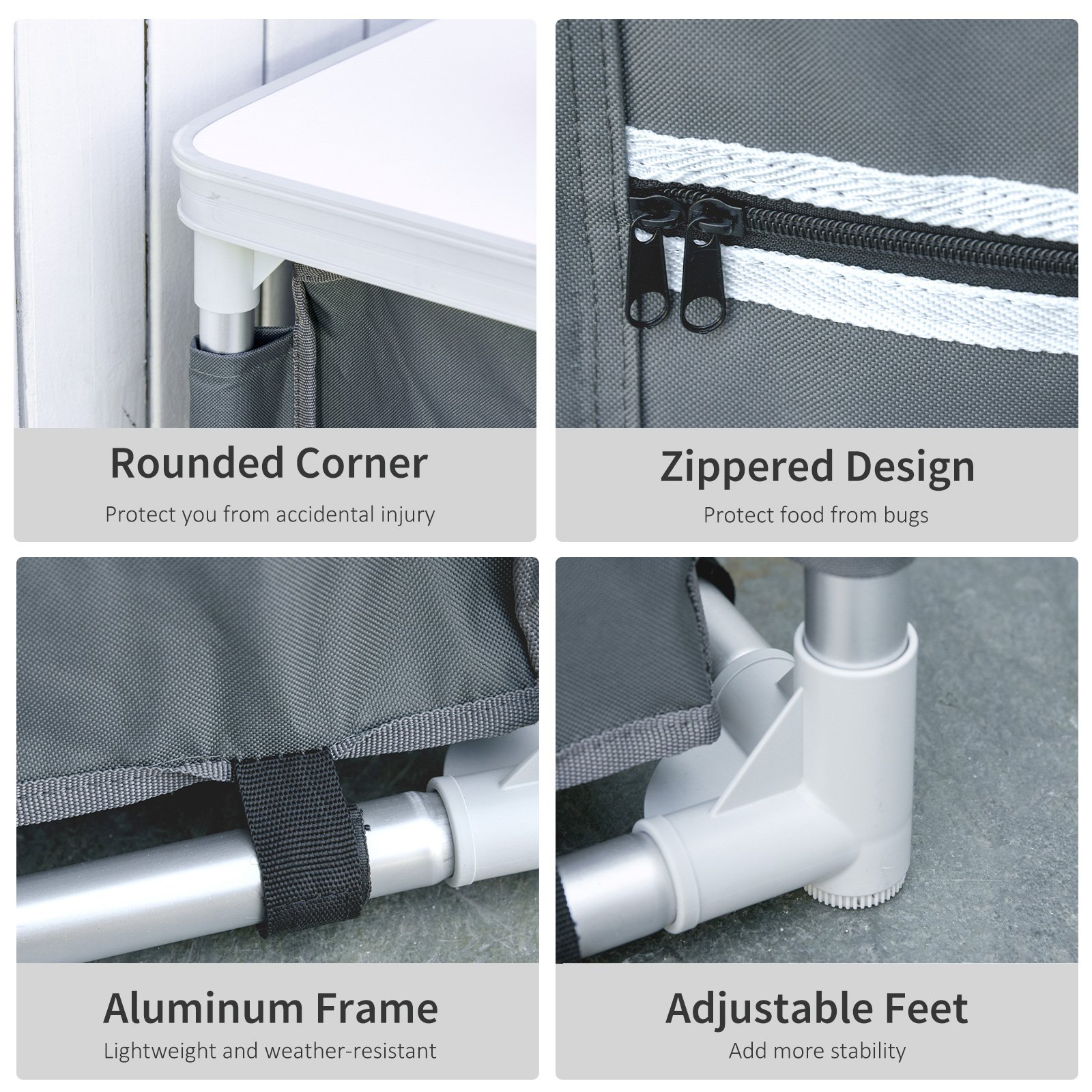 2-IN-1 DESIGN: Featuring a worktop and a storage cabinet, this camping storage unit lets you prepare and serve food on top and store supplies underneath. Perfect for picnics, backyard barbecues, tailgating parties, or an overnight hit outdoors.AMPLE STORAGE SPACE: Beneath the outdoor kitchen unit is a 3 shelf storage cupboard, for storing your food, cans, salt and pepper grinders and outdoor kitchen utensil with good classification. The door can be zipped shut and also rolled and tied aside to allow easy access.SOLID STRUCTURE: Constructed of aluminum alloy frame with MDF tabletop, this portable camping cooking table can hold up to 25kg. The rounded corner can protect your kids from hurt. And the feet are adjustable for added stability.EASY TRANSPORT AND STORAGE: Tear down into the included carrying bag weighing just 6kg.PRODUCT DIMENSIONS: Overall Dimension: 60L x 50W x 104.5Hcm, Weight Capacity: 25kg(Tabletop), 5kg(Shelf). Assembly required.