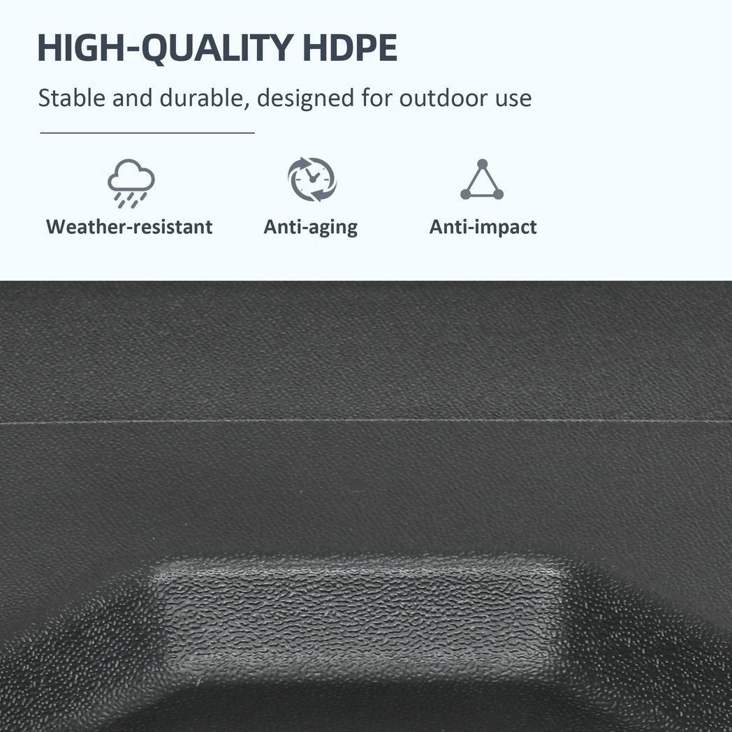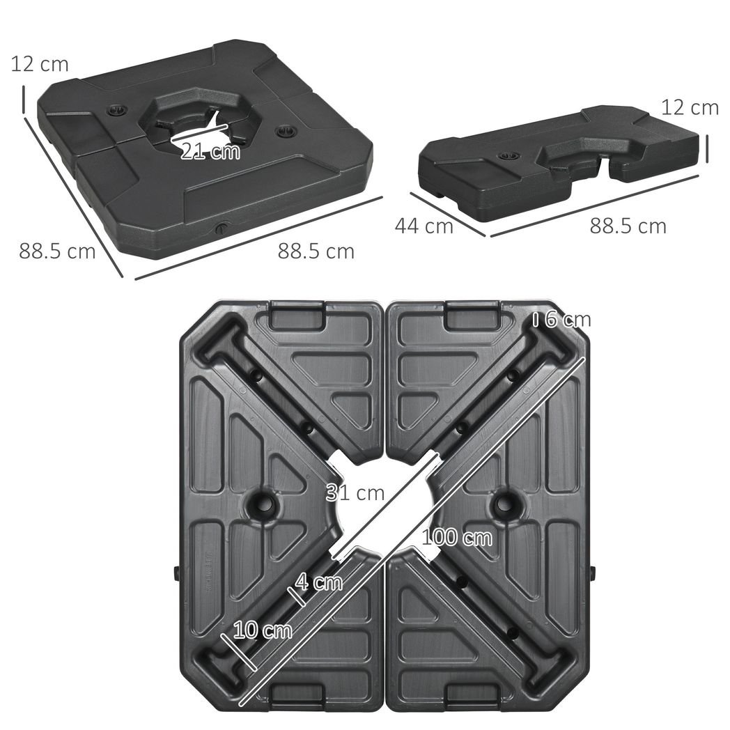 Two-piece weights: Made for cantilever parasols, the weights for umbrella stand keeps your summer garden umbrella upright and in place to provide shade outdoors. Cross base not included.Water/sand filled: Our parasol weights weigh 70kg in total when filled with water, 110kg when filled with sand. You can also fill with dry sand and then add water to increase the weight.All for your convenience: Each weight plate features a filling port: easy to fill up, and easy to empty. The built-in handles allow you to carry them easily. When in transport or just not in use, just stack the patio umbrella base together to a compact size.All-weather HDPE: Made of thick HDPE which is tough, sturdy, anti-aging and weather-resistant, the weights for parasol are suitable for outdoor use.Overall dimensions: 88.5L x 88.5W x 12H cm. Single plate: 88.5L x 44W x 12H cm. Suitable cross base bar size: 100L x 10W x 6H cm, please measure in advance to ensure our weight can fit well. Suitable Outsunny offset parasol parent SKUs: X-840-126, X-840-065, X-84D-104, X-84D-187, X-84D-161, please consult customer service for product links if you need.