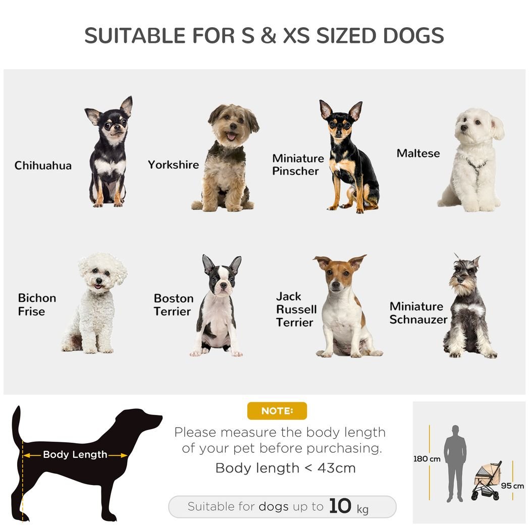 LARGE BASKET: Plenty of room for your pet to rest, protected with an adjustable overhead canopy. Mesh window so they can breathe. Zipped door for easy access. Two inner leashes for safety.FOUR WHEELS: Brakes on rear wheels for safety and 360� moving front wheels for smooth movement. The push handle can be reversed back and forth to meet your different needs.STEEL FRAME: Structure is sturdy and keeps its shape when being used. Frame is foldable and lightweight so it can be stored and carried easily. Features bottom basket and zipped pouch for storage.DIMENSIONS: 95H x 76.5L x 52Wcm. Inner: 51H x 63L x 36Wcm. Folded: 27H x 80L x 52Wcm. Basket: 14H x 34L x 27.5Wcm.FOR SMALL DOGS, SUCH AS BICHON FRISE AND PUG. WEIGHT CAPACITY: 15KG. ASSEMBLY REQUIRED. Suitable for small and miniature dogs less than 43 cm in length and less than 10 kg in weight. Note: Please measure the body length of your dog before purchasing.