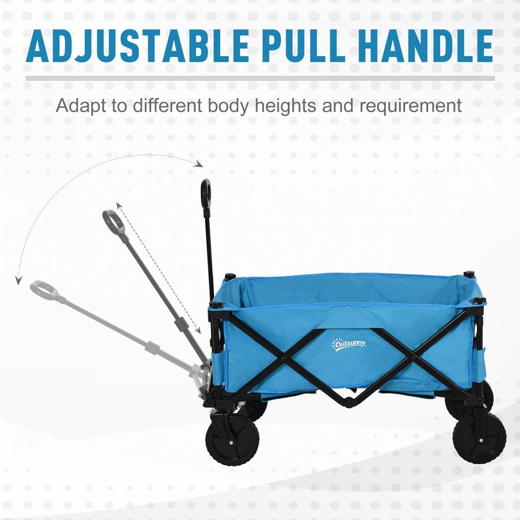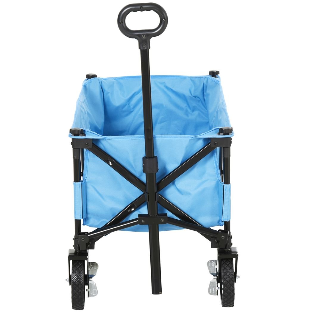 SPACIOUS GARDEN CART: A must for your outdoor trips, the folding trolley cart allows you to take all you need for the journey easily and all at once  saving you effort and time.STEEL FRAME: A strong and reliable structure keeps the festival trolley in shape for peace of mind whilst on-the-go.FOUR MULTI-GROUND WHEELS: Two of which rotate 360 to prevent camping trolley getting stuck whilst pulling, all wheels can move easily and smoothly. The front two universal wheels with brake guarantee the safety of garden trolley. TELESCOPIC HANDLE: Extends out for you to pull it along without having to bend down  preventing you from straining your body.FOLDABLE: Easy to store at home or in the boot of your beach trolley cart and bring out when needed. DIMENSIONS: 91.5H x 107L x 51Wcm. Folded: 23H x 75L x 40.5W. Storage Box: 32H x 89.5L x 48WcmMAXIMUM LOAD 68KG. EASY TO ASSEMBLE.